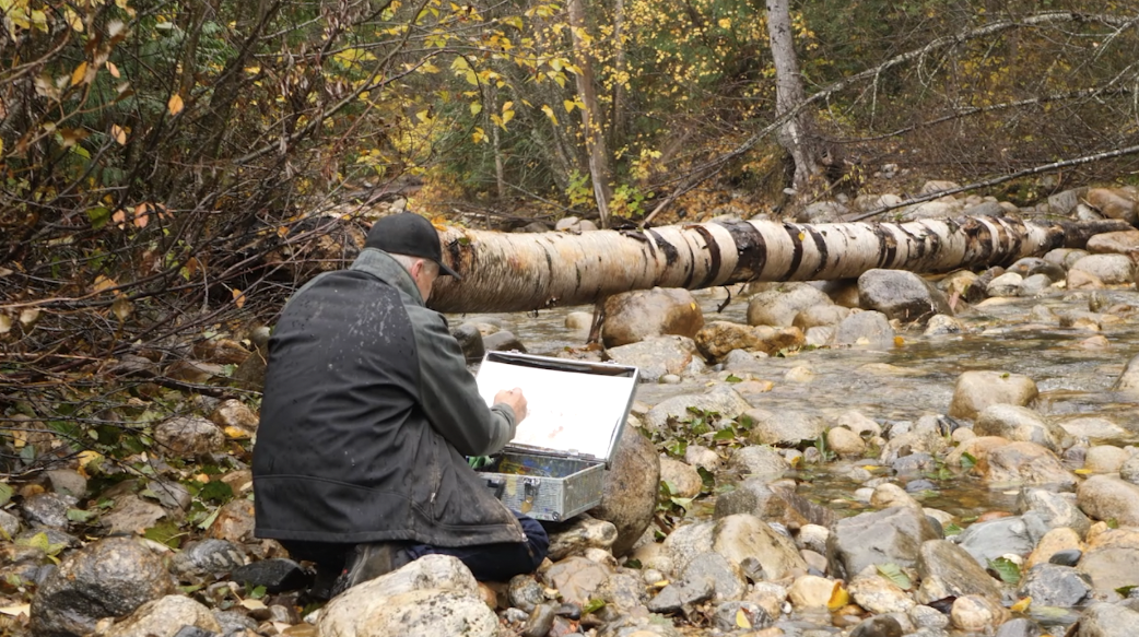 Ron Mulvey finds particular inspiration in his own backyard, 26 acres of natural beauty that include the little Slocan River. This is his favorite place to sketch and gather creative ideas for his fine art sales.